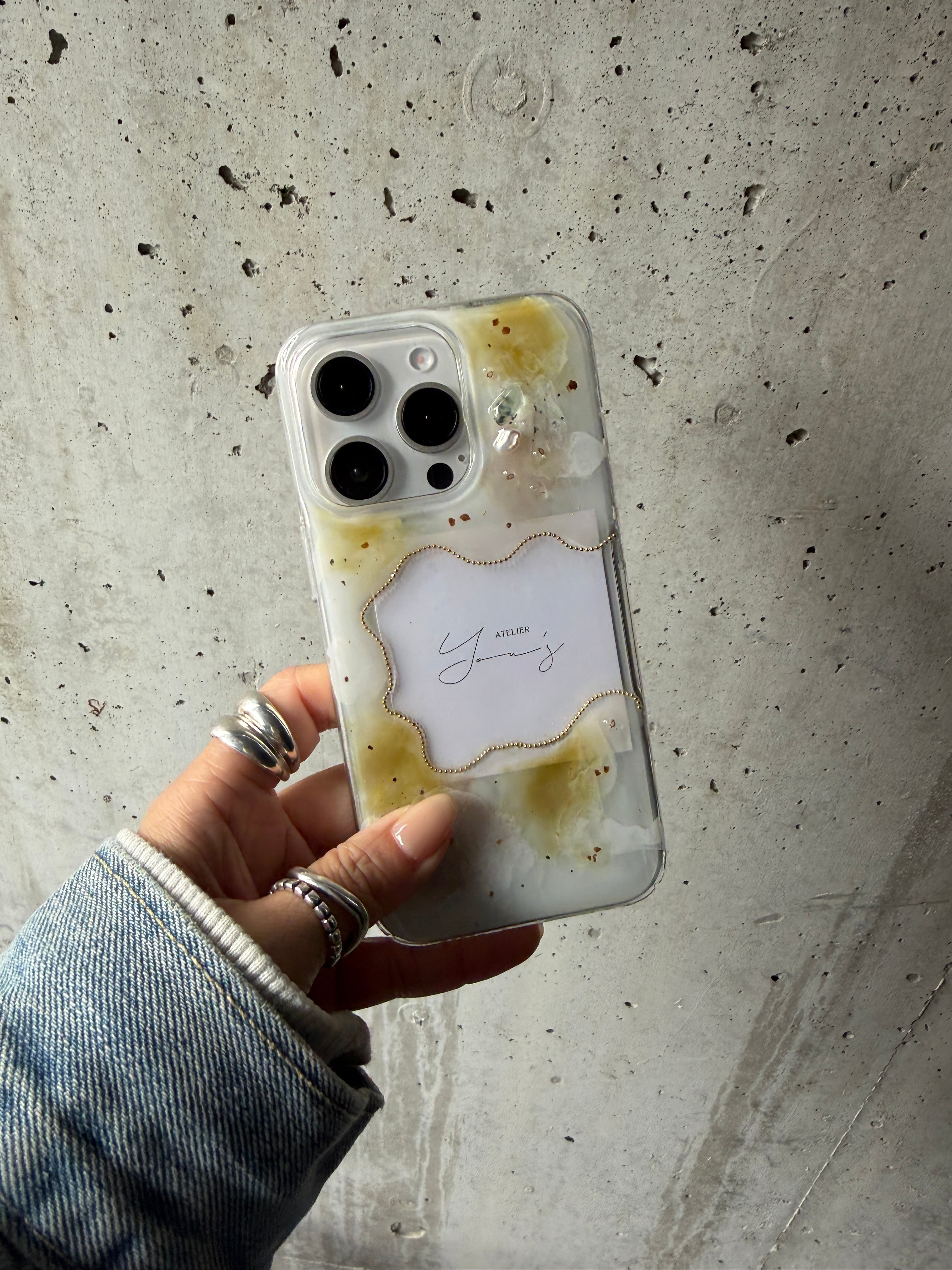 ◎ピスタチオカラーを絶妙なバランスで組み合わせ、ゴールドパーツで統一した、透け感のある大人のためのスマホケース。