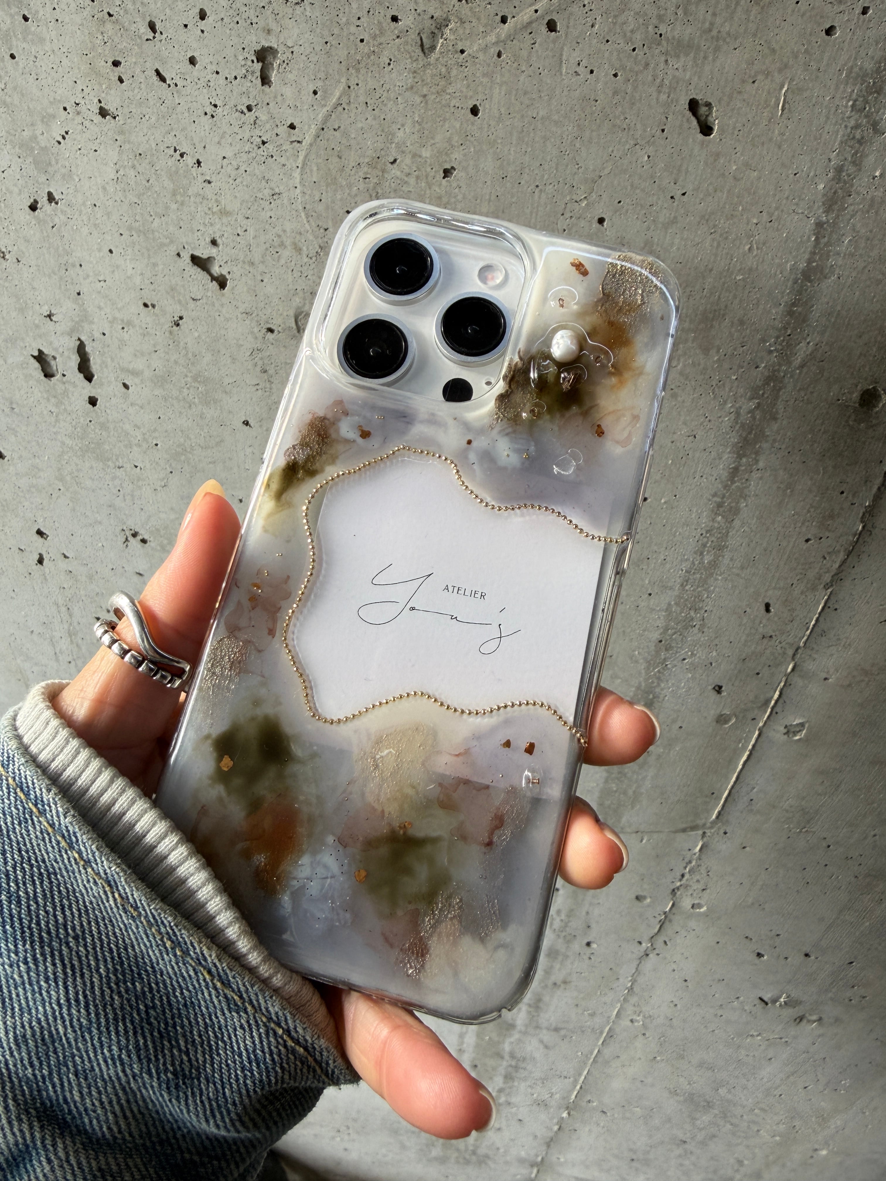 ◎グレー、ダークグリーン、ブラウンカラーを絶妙なバランスで組み合わせ、ゴールドパーツで統一した、透け感のある大人のためのスマホケース。